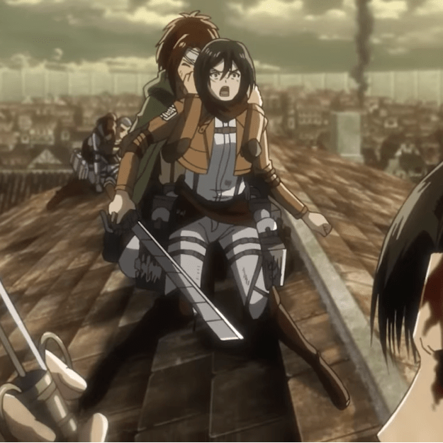 《進擊的巨人》動畫第二季第37集《怒吼》,情節對照漫畫第50話,成為少數能感知到一絲絲情愛與告白的章節(令人驚奇的是,儘管駭人恐怖的無垢巨人在四周隨時伺機而動,WIT Studio動畫組仍巧妙地賦予這一幕一絲絲浪漫氛圍)。儘管情感若隱若現,但在這一回中,可以隱約感受到諫山創巧妙地呈現出艾連和米卡莎之間心意相通、互相扶持的重要情節。在前往瑪雷篇之前,這也是少數凸顯艾連和米卡莎情感重要的互動片段之一。這關鍵的一回,不僅奠定了先前所述的艾連與米卡莎心靈相通的感情線索,更為已經預設的結局鋪陳基礎。其次,也為米卡莎賦予了更為豐富、生動、勇敢且無懼的形象。諫山創曾在2017年的一次公開訪談中透露:「最後會設定為三個人,是因為我把『知識、勇氣、力量』分別賦予了三位主角。而把米卡莎定位為『力量』的原因是,我想『讓女性擔任特攝戰隊影片中的領隊紅,應該會很有趣吧?』」。
