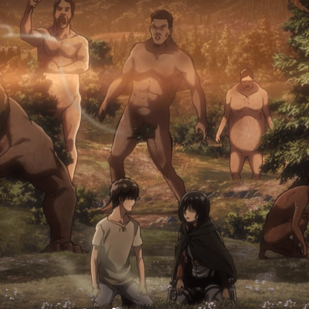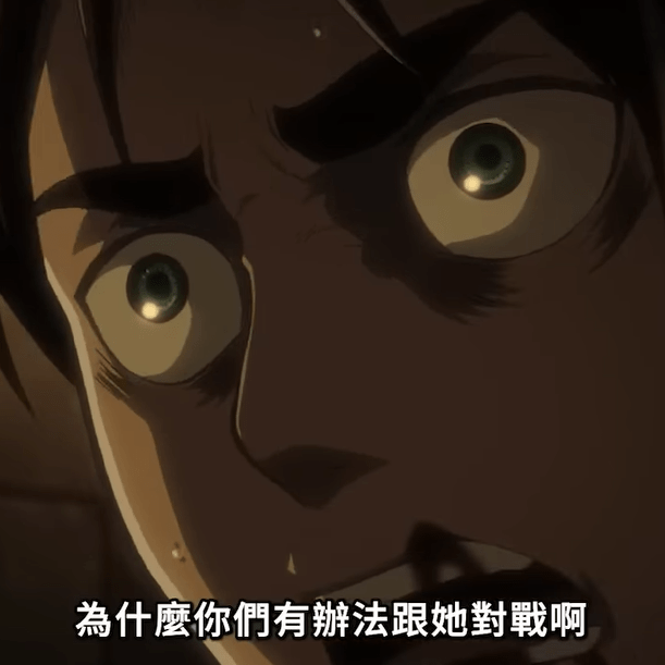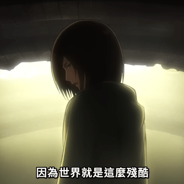 這裡有一個很有意思的前後對比很值得一提:回到第一季的史托黑斯區急襲、艾連對抗女巨人的情節。艾連因為女巨人是亞妮,失去了繼續戰鬥的意志。在作戰計畫失敗後,他還是只能依賴米卡莎和阿爾敏的赴死決心來保護自己。艾連在這裡大聲詢問米卡莎和阿爾敏:「為什麼呢?」(指的是與亞妮的交鋒)。阿爾敏沒有回應他,唯獨米卡莎停下了腳步,冰冰冷冷地說:「還有什麼辦法呢,因為這個世界就是這麼殘酷。」正是這番回應,讓一度無法變身成為巨人的艾連隨後找回了戰鬥的決心。這也為艾連後來為何推開了他最信任和依賴的夥伴們,埋下了伏筆。