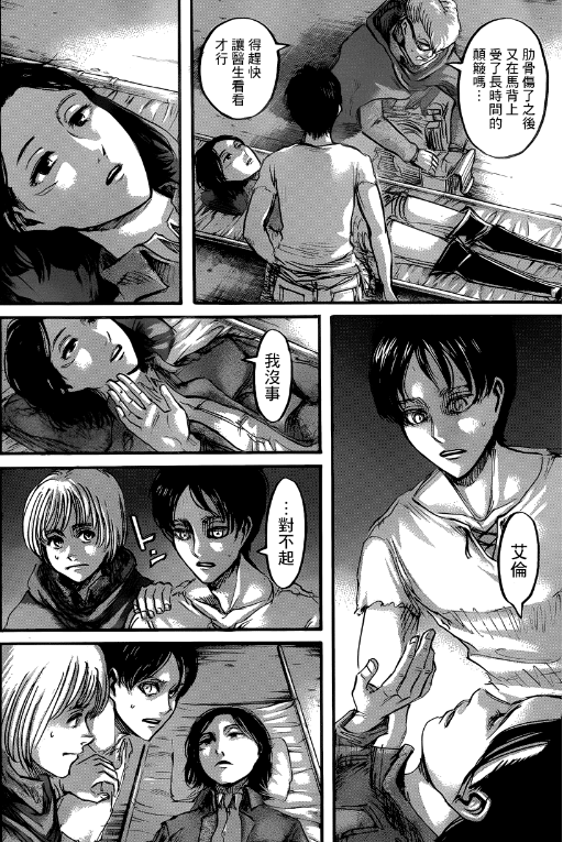 首先提及漫畫的第51話,這段遭到動畫組(惡意)刪減的場景。艾連奪回戰、米卡莎向他「告白」後,艾連向米卡莎道歉的一幕。因為她為了救艾連而被無垢巨人抓住,扭斷了肋骨。我記不太清動畫中是否還有其他場景呈現艾連主動向米卡莎道歉的情節,但兩人自小一起經歷了如此多的波折,尤其在目睹漢尼斯的悲慘死亡之後,這句「對不起」的道歉顯得意味深長。