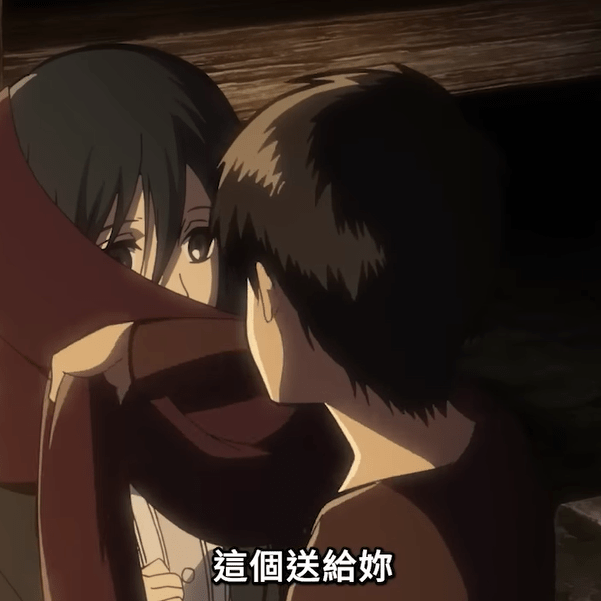 作者精心設計的這一情節,再加上阿爾敏和艾連在道路上的對話,已經足以呈現艾連對米卡莎的愛和在乎。正如我之前所言,這樣的愛情不需要言辭激昂,也無需過於親密或煽情的描繪。這種充滿含蓄、內斂,散發著絲絲溫柔的愛情,完美地呼應了漫畫家獨有的風格、世界觀,以及人性最真實的一面,正如由 Linked Horizon所撰寫片尾曲歌詞的編曲,艾連不只是為米卡莎圍上了圍巾、給予了米卡莎一個家和一個真摯的愛,同時也教會了米卡莎如何在這個美麗又殘酷的世界中活下去: