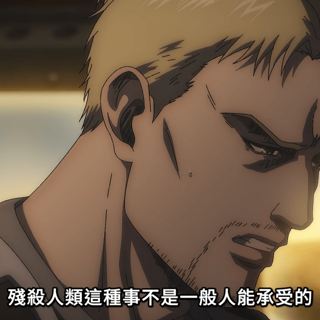 在「天與地之戰」即將展開之際,萊納、皮克以及其他主要角色乘坐飛艇趕往阻止艾連的地方。這段場景中的對話和對手戲設計無疑是經典之作。回顧到漫畫第133話,題為「罪人們」,當104期夥伴們相互坦白殺害同伴和無辜之人的罪孽後,進而理解並彼此和解時,我一直感受到一種共鳴。104期的眾人或多或少其實都明白,「殺掉艾連」可能是無奈的最終手段。就連曾經與艾連激烈廝殺的萊納,也對此心生懷疑和困惑,因為他自己與艾連的遭遇極度相似。我不認為萊納痛恨艾連屠殺他的家鄉瑪雷,相反,此時的萊納全心全意地想要彌補自己的殘忍罪行。基於這樣的懺悔,他似乎自言自語地提出這樣的疑問:「艾連,是不是希望我們阻止他?」在這一刻,無論是在漫畫中還是動畫中,都給予了米卡莎一個獨立的特寫,追問:「什麼意思?」而萊納則繼續說:「殘殺人類這種事情不是一般人能夠承受的。」值得注意的是,由於動畫與漫畫的翻譯存在差異,且動畫這裡的台詞有所修改,但我認為漫畫更生動地表達了其中的痛苦情緒。