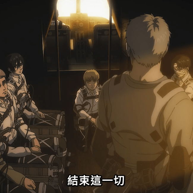 這段鋪陳很重要,因為演到這裡的時候大家都已經在猜測艾連這麼放任他們不管的動機是什麼。和艾連最親近的阿爾敏都有了這樣的懷疑,艾連是否期待著同伴們做出什麼回應?盡管緊接著發生的一幕,就是艾連把所有人拉到了座標的世界裡,宣告他不會解除地鳴的意志。所有人都陷入了驚愕,而其中打擊最大的無疑地仍然是是阿爾敏與米卡莎。「為什麼艾連會變成這樣呢?為什麼就不能好好談一談呢?」結局也告訴我們,當然,艾連的確是希望有個人能夠阻止他,這也印證了在這一段中萊納的苦澀自語:「換作是我的話,反而會希望把始祖的力量交給別人,如果做不到的話,就讓某個人來...結束這一切。」接著將痛苦的眼光轉移到了眾多主角身上。